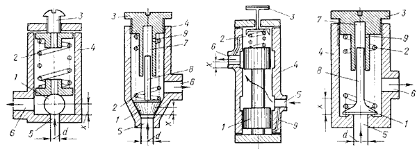 а - с шариковым; б - с конусным; в - с золотниковым; г - с тарельчатым