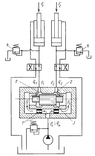 Делитель потока (рис.6.9) состоит из двух нерегулируемых дросселей 1 и двух дросселей 2, проходные сечения которых могут автоматически изменяться благодаря перемещению плунжера 3. При равенстве нагрузок (F1 = F2) и площадей поршней гидроцилиндров давление P1 = P2 , перепад давлений ΔP = (P3 - P4) = 0, плунжер 3 делителя занимает среднее положение, а расходы в обеих линиях одинаковые. Если нагрузка на один из любых гидродвигателей изменится, то под действием возникшего перепада давлений у плунжера делителя он начнет смещаться из среднего положения, изменяя одновременно проходные сечения дросселей 2. Перемещение прекратится, когда давления P3 и P4 выровняются. В этом положении плунжера расходы в обеих ветвях будут одинаковыми. Таким образом, поддержание равенства расходов в обеих ветвях осуществляется за счет дросселирования потока в той ветви, где гидродвигатель нагружен меньше.