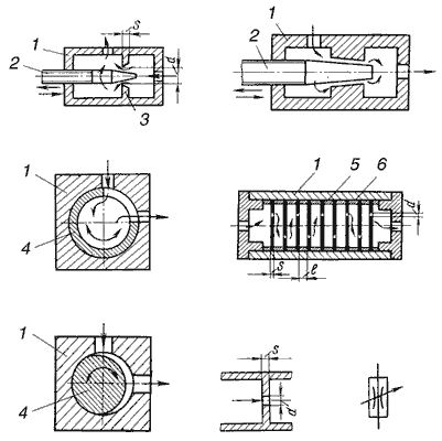 В регулируемых (рис.6.11, а, б, в, г) и нерегулируемых (рис.6.11, д, е) нелинейных дросселях длина пути движения жидкости сведена к минимуму, благодаря чему потери давления и расход практически не зависят от вязкости жидкости и изменяются только при изменении площади рабочего проходного сечения. Максимальную площадь устанавливают из условия пропуска заданного расхода жидкости через полностью открытый дроссель, минимальную - из условия исключения засоряемости рабочего окна.