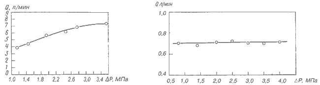 Недостатком дросселей является неравномерность расхода, вызванная изменением перепада давлений у дросселя. На рис.6.12, а приведена проливочная характеристика дросселя Г77 11 Q = f(ΔP), из которой видно, что с изменением перепада давлений (вызванного, например, изменением нагрузки на гидродвигатель)