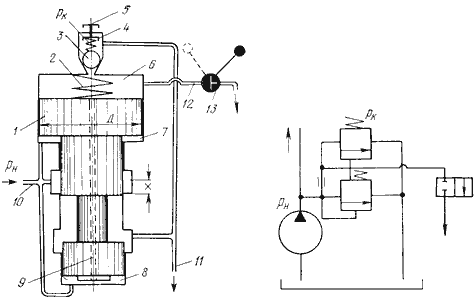 Для разгрузки системы или какого-либо ее учатка клапаны непрямого действия могут управляться дистанционно. Для этого полость 6 посредством канала 12 и крана 13 необходимо соединить со сливом. В результате давление в полости 6 резко упадет, золотник 1 поднимется вверх, а линия высокого давления 10 соединится со сливом 11.