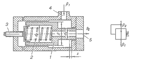 Редукционный клапан (рис.6.4) состоит из запорно-регулирующего элемента - плунжера 1, прижатого к седлу пружиной 2, сила натяжения которой регулируется винтом 3. Отверстие 4 корпуса соединяется с гидролинией высокого давления, а отверстие 5 с гидролинией низкого давления. В исходном положении клапан прижат к седлу, а вход клапана отделен от выхода. При повышении давления P1 плунжер поднимается и гидролиния высокого давления соединяется с гидролинией низкого давления. Чем больше давление P1, тем больше открывается проходное сечение клапана и тем больше становится давление P2.