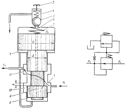 Это в свою очередь вызовет понижение давления в полостях 11, 8 и 7, опускание золотника и увеличение площади живого сечения между полостями 10 и 11. Процесс повторится снова, и золотник, совершая колебательные движения, установится на определенной высоте. Всякое изменение давления на входе или выходе клапана вызывает ответное перемещение золотника. В конечном итоге за счет изменения дросселирования давление на выходе клапана поддерживается постоянным. В этом клапане полость 7 и узкий канал, соединяющий полость с выходом клапана, оказывают демпфирующее влияние на золотник, уменьшая его колебания.