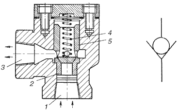 Клапан состоит из запорно-регулирующего элемента 1 (шарика, конуса и т.д.), пружины 2, натяжение которой можно изменять регулировочным винтом 3. Отверстие 5 корпуса 4 соединяется с линией высокого давления, а отверстие 6 - со сливной линией. Часть корпуса, с которой запорно-регулирующий элемент клапана приходит в соприкосновение, называется седлом (посадочным местом).