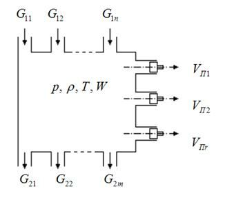 Зависимости (1.66) и (1.67) легко распространить на более общий случай, когда газ в полость подается из нескольких источников, отводится в несколько каналов и двигает несколько поршней.