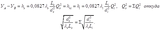 3. При аналитическом решении системы уравнений (1,2,3) удобно заменить пучок параллельных труб одной эквивалентной трубой, которая пропускает весь расход, проходящий через параллельные трубы, при потерях напора, равных потерям напора на разветвленном участке.