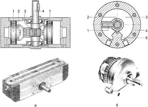 Поршневой поворотный пневмодвигатель с реечной передачей (рис. 7.1, а) выполняют на базе передачи «шестерня — рейка». Шестерня 3 устанавливается на выходном валу 4, входит в зацепление со штоком-рейкой 2, который жестко связан с поршнями 1 двух разнонаправленных цилиндров одностороннего действия.