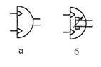 Рис. 7.2. Условное графическое обозначение поворотных пневмодвигателей: а — общее; б — с демпфированием в конце хода