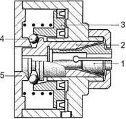 Цанговый зажим состоит из следующих основных деталей: цанги 1, обжимной втулки 2, кольцевого поршня 3 с пружинным возвратом, шариков 4 и корпуса 5.