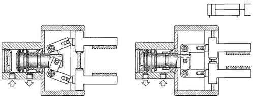 Для разжатия заготовки сжатый воздух из поршневой полости сбрасывают в атмосферу, при этом поршень возвращается в исходное положение, освобождая шарики. В результате цанга разжимается, смещая обжимную втулку в исходную позицию.