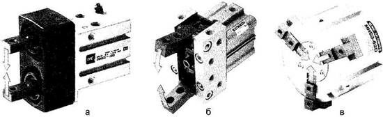 По конструктивному исполнению захваты подразделяются на параллельные (рис. 7.10, а), поворотные (рис. 7.10, б) и трехточечные (рис. 7.10, в).