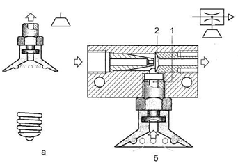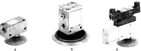 Помимо типовых конструкций эжекторов (рис. 7.12, а) производители элементов промышленной пневмоавтоматики выпускают эжекторные головки с принудительным отталкиванием детали от присоски с помощью сжатого воздуха после завершения операции захвата (рис. 7.12, б), а также компактные эжекторы с электромагнитным управлением процессом захвата и отталкивания заготовки (рис. 7.12, в).