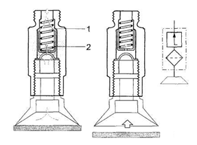 При повреждении присоски или ее контакте с неочищенной поверхностью захватываемого объекта подпружиненный запорный элемент 2 прижимается к седлу 1 клапана, образующимся воздушным потоком, тем самым резко ограничивая возможность попадания воздуха в вакуумную систему. В результате в систему через дроссельное отверстие запорного элемента 2 проникает только небольшая часть воздуха, благодаря чему вакуум в других захватах сохраняется.