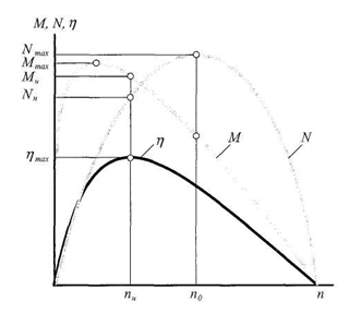 При эксплуатации пневмомоторов существенное значение имеет такой установившийся режим, при котором достигается максимальная производительность машины. Этому режиму соответствуют статические характеристики крутящего момента М, мощности N и общего КПД, определяемые теоретически или экспериментально при постоянной частоте вращения п (рис. 7.4).