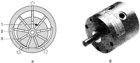 Принципиальная конструктивная схема шиберного (пластинчатого) пневмомотора (рис. 7.5) практически не отличается от ранее рассмотренной конструктивной схемы пластинчатого компрессора.