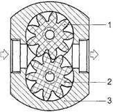 В корпусе 3 шестеренного пневмомотора расположены две находящиеся в зацеплении шестерни 1 и 2 (зубчатые колеса), причем одна из них закреплена на выходном валу или выполнена заодно с ним, а другая свободно вращается на опорах, установленных в корпусе (рис.7.6).