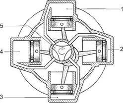 Сжатый воздух одновременно подается в две рабочие камеры пневмомотора, например 1 и 2, через крановый распределитель 5, установленный на выходном валу. При этом соответствующие поршни, перемещаясь к нижней «мертвой точке», передают усилие на коленчатый вал через свои шатуны. После поворота вала, а вместе с ним и распределителя на некоторый угол сжатый воздух подается в рабочие камеры 2 и 3, а отработавший воздух из камер 4 и 1 сбрасывается в атмосферу также через крановый распределитель. Далее этот цикл повторяется.