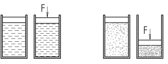 Основной отличительной особенностью капельных и газообразных жидкостей является способность сжиматься (изменять объем) под воздействием внешних сил. Капельные жидкости (в дальнейшем просто жидкости) трудно поддаются сжатию, а газообразные жидкости (газы) сжимаются довольно легко, т.е. при воздействии небольших усилий способны изменить свой объем в несколько раз (рис.1.3).