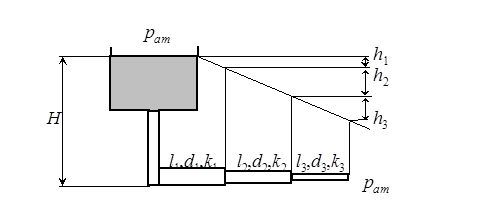 Формула показывает, что трубопровод, составленный из последовательно соединенных труб разного диаметра и длины, можно рассматривать как простой трубопровод, суммарные потери напора, в котором равны сумме потерь напора составляющих его труб.