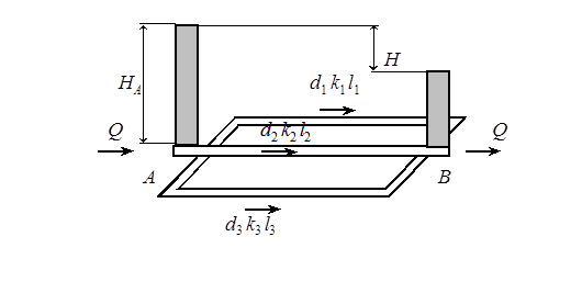 Особенность гидравлической схемы работы трубопровода при параллельном соединении труб состоит в том, что все трубы работают под действием напора