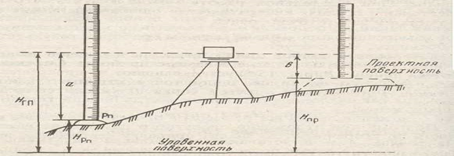 Для выноса в натуру точки с проектной отметкой Нпр устанавливают нивелир примерно посредине между репером с известной отметкой НРп и выносимой точкой (рисунок 3). На исходном репере и выносимой точке устанавливают рейки, взяв отсчет а по рейке на исходном репере, определяют горизонт прибора: