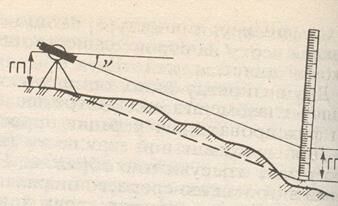 На вертикальном круге с учетом места нуля устанавливают отсчет в градусной мере, равный проектному уклону. Линия визирования зрительной трубы теодолита будет фиксировать угол наклона v, соответствующий