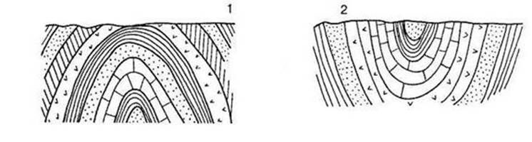 Первый тип тектонических деформаций, вызванный радиальными движениями в чистом виде, выражается в пологих поднятиях и прогибах земной коры, чаще всего большого радиуса. Колебания, вызывающие образование подобных форм, в отличие от сейсмических колебаний совершаются относительно медленно, ощутимых разрушений не приносят и непосредственным наблюдениям человека не поддаются.