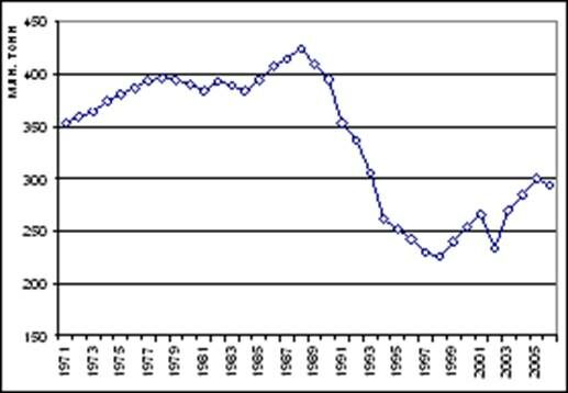 Рисунок – Динамика объемов добычи ископаемого угля в РСФСР и РФ за период с 1971 по 2007 гг.