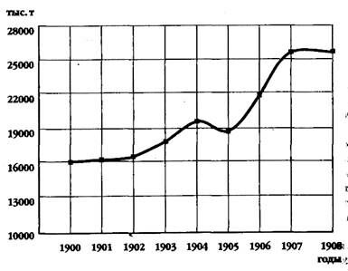 Динамика годовых объемов добычи ископаемого угля по Российской империи за период 1900-1908гг