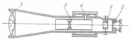 Основными частями зрительной трубы является: объектив 1, окуляр 2, внутренняя фокусирующая линза 3, которая перемещается внутри трубы вращением кремальеры 4 (кремальерного винта или кольца) и сетки нитей 5.