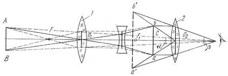Объектив и окуляр трубы располагают т.о. чтобы при установки трубы на бесконечность передний фокус окуляра совпадал с задним фокусом объектива и плоскостью сетки нитей. В окулярной части трубы находиться сетка нитей на которую проектируется изображение наблюдаемого предмета, между объективом и окуляром располагается двояковогнутая фокусирующая линза, которая перемещается при помощи кремальеры.