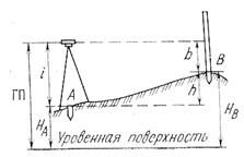Для определения превышения между точками А и В на точку с известной отметкой (заднюю) устанавливают нивелир таким образом чтобы его окуляр находился на одной отвесной линии с этой точкой и при помощи рулетки измеряют высоту инструмента i. В точку отметку которой определяют (переднюю) вертикально устанавливают рейку и берут по ней отсчет b.