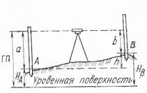 Для определения превышения между точками А и В на них вертикально устанавливают рейки и на равном удалении от них устанавливают нивелир, приводят его в рабочее положение.