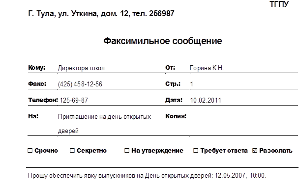 6. Формируем письмо-факс Приглашение на день открытых дверей по стандартному шаблону прикладной программы MS Word (произвольная форма).
