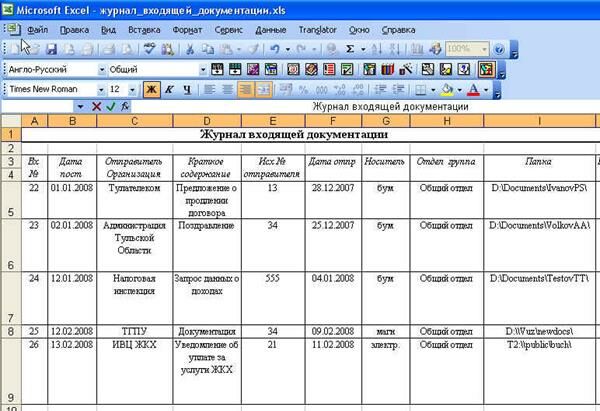 В качестве примера приведен фрагмент Журнала входящей документации