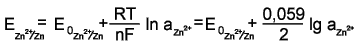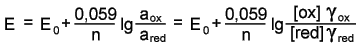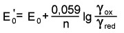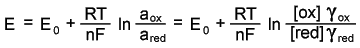 E=E0 при aox = ared = 1, причем имеется в виду гипотетический стандартный 1 М раствор, в котором коэффициент активности каждого растворенного вещества равен 1, а чистые вещества находятся в наиболее устойчивом физическом состоянии при данной температуре и нормальном атмосферном давлении.