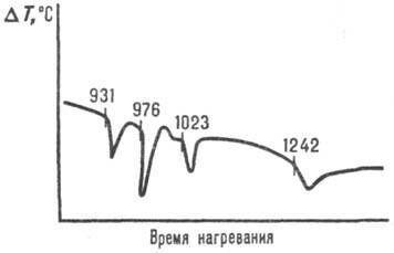 В Т. а. можно фиксировать т. наз. кривые нагревания (или охлаждения) исследуемого образца, т.е. изменение т-ры последнего во времени. В случае к.-л. фазового превращения в в-ве (или смеси в-в) на кривой появляются площадка или изломы. Большей чувствительностью обладает метод дифференциального термического анализа (ДТА), в к-ром регистрируют во времени изменение разности т-р T между исследуемым образцом и образцом сравнения (чаще всего Аl2О3), не претерпевающим в данном интервале т-р никаких превращений. Минимумы на кривой ДТА (см., напр., рис.) соответствуют эндотермич. процессам, а максимумы - экзотермическим. Эффекты, регистрируемые в ДТА, м. б. обусловлены плавлением, изменением кристаллич. структуры, разрушением кристаллич. решетки, испарением, кипением, возгонкой, а также хим. процессами (диссоциация, разложение, дегидратация, окисление-восстановление и др.). Большинство превращений сопровождается эндотермич. эффектами; экзотермичны лишь нек-рые процессы окисления-восстановления и структурного превращения. На вид кривых ДТА, как и на вид кривых в термогравиметрии, оказывают влияние мн. факторы, поэтому воспроизводимость метода, как правило, плохая.