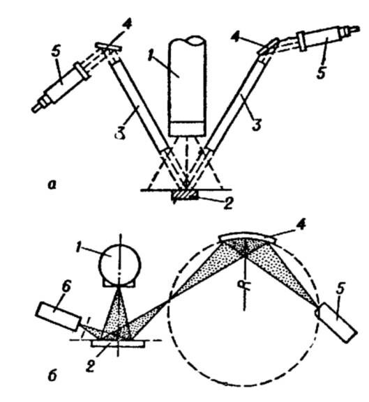 Рис. Схема рентгеновского многоканального флуоресцентного спектрометра с плоским (а) изогнутым (б) кристаллами: 1 – рентгеновская трубка; 2 – анализируемый образец; 3 – диафрагма Соллера; 4 – плоский и изогнутый (радиус – 2R) кристалл – анализаторы; 5 – детектор излучения; 6 – так называемый монитор, дополнительное регистрирующее устройство, позволяющее осуществлять измерение относительной интенсивности спектральных линий при отсутствии стабилизации интенсивности источника рентгеновского излучения; R – радиус так называемой окружности изображения.