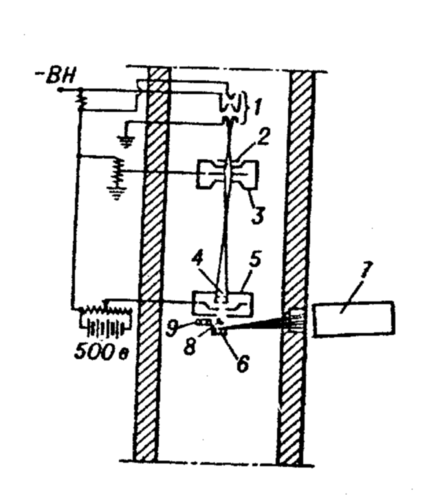 1 – электронная пушка; 2 – диафрагма; 3 – первая собирающая электростатическая линза; 4 – апертурная диафрагма; 5 – вторая собирающая электростатическая линза; 6 – исследуемый образец; 7 – рентгеновский спектрометр; 8 – зеркало; 9 – объектив металлографического оптического микроскопа; ВН – высокое напряжение.