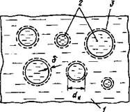1 – нефть (дисперсионная среда); 2 – глобулы воды; 3 – оболочки: δ – толщина бронирующего слоя; dк – диаметр глобулы воды