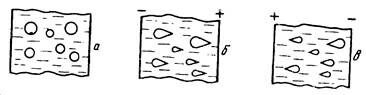 Действие электрического поля на эмульсию иллюстрирует рис. 20. В обычном состоянии (а) взвешенные в нефти капли воды имеют сферическую форму. Если на этот объем эмульсии наложено электрическое поле переменного тока (б), то капли воды приобретают грушевидную форму, вытягиваясь по направлению к электроду, где э. д. с. положительна (соленая вода как электролит приобретает в поле отрицательный заряд). По истечении одного периода времени полярность электродов меняется (в) и картина воздействия поля на капли становится иной - они вытягиваются в обратном направлении.