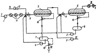 1 – 4 – насосы; 5, 6 – электродегидраторы; 7, 8 - промежуточные емкости-отстойники; 9 – смесительные устройства; 10 – регулирующие клапаны; 11, 12 – теплообменники; 13 – дозатор; I, II – сырая и обезвоженная нефть; III – свежая пресная вода; IV – дренажная соленая вода; V – раствор деэмульгатора.