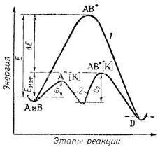 На рис. 39 показано изменение энергии реагирующей системы для указанной реакции. Если Е – энергия активации некаталитической реакции, Ев – энергия активации каталитической реакции, е1 и е2 энергии активации промежуточных стадий, то Ев < Е – катализ положительный.