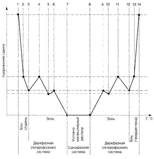 На участках 1-7 и 8-14 в системе происходят структурные превращения, обусловливающие различие конфигураций элементов пространственной структуры, и соответственно проявление системой принципиально новых физико-механических и физико-химических свойств. Изменяется прочность структурных образований, химический состав, порядок расположения молекул, межмолекулярные силы взаимодействия и т.п. Например, можно предположить, что участок 1-3 включает зону упруго-хрупких и упруго-пластичных гелей. На участке 3-7 могут проявляться зоны кинетически неустойчивого состояния золя или кинетически устойчивого состояния. На участке 1-7 могут проявляться эффекты плавления и стеклования.