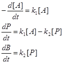 Р – промежуточный продукт (реальное вещество или метастабильная частица). Скорости процессов описываются системой уравнений: