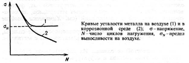 Проявляется при одно­временном воздействии на металл циклич. (знакоперемен­ных) напряжений и коррозионных сред; одна из наиб, часто встречающихся разновидностей коррозии под напряжением. Характеризуется понижением предела выносливости ме­талла (макс, напряжения, при к-ром еще не происходит разрушения металла при воздействии установленного числа циклов знакопеременной нагрузки, или базы испытания). Кривая усталости металла в коррозионной среде (см. рис.) по мере увеличения числа циклов непрерывно понижается, в отличие от кривой усталости на воздухе, к-рая имеет гори­зонтальный участок, соответствующий пределу выносли­вости. Т. обр., К. у. характеризуется отсутствием истинного предела выносливости и определяется т. наз. условным пре­делом выносливости при заданной базе испытания.