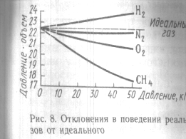 Реальные газы плохо описываются уравнением состояния идеального газа, причем наибольшие отклонения от идеальности наблюдаются в области высоких давлений и низких температур. Это связывают с увеличением влияния на свойства систем собственного объема молекул газа: во- первых, объем молекул газа становится соизмерим с общим объемом системы, а во-вторых, начинают проявляться силы межмолекулярного притяжения ( в связи с чем, давление сжатых газов меньше рассчитанных величин).