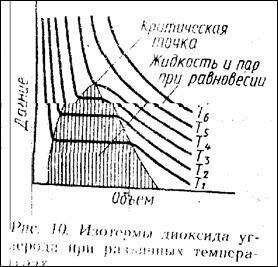 Явление межмолекулярного притяжения в газах приводит к возникновению понятий критических постоянных и критической точки газа. При высоких температурах межмолекулярное притяжение мало влияет на поведение газа и зависимость р–V близка к выполнению закона Бойля-Мариотта. При понижении температуры внутренняя энергонасыщенность молекул газа (колебательное, вращательное движение) снижается настолько, что силы притяжения способны фиксировать молекулы друг возле друга, создавая ближний порядок – т.е. упорядоченное состояние вещества в микрообъеме (размером в несколько молекул). Ближний порядок характерен для жидкостей, т.о. газ конденсируется в жидкость. Этой точке соответствует точка кипения вещества, но достичь этого состояния можно и при температурах гораздо более высоких, чем Ткип путем изменения давления и объема. Однако величина внутреннего энергозапаса молекул газа (внутренняя энергия) должна быть ниже определенного уровня. В результате на изотерме газа появляется область аномального поведения. Горизонтальное положение изотерм внутри этой области соответствует жидкости. Верхняя точка купола соответствует особенной критической точке – в этой точке существует лишь одна фаза, не являющаяся ни жидкостью, ни газом. Каждый газ характеризуется индивидуальной критической точкой, которой соответствуют критические температура, давление и объем. Выше критической температуры газ ни при каких условиях не может быть сжижен.