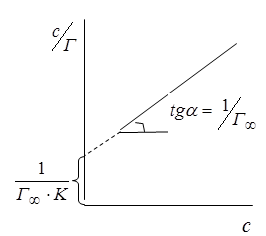 т.е. сорбция выражается линейной зависимостью. Наклон прямой прямо пропорционален , на оси ординат отсекается отрезок, равный .