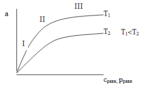 Адсорбцию чаще всего характеризуют зависимостью количества адсорбируемого вещества а от концентрации или давления  при Т = соnst. Эти зависимости называются изотермами адсорбции.